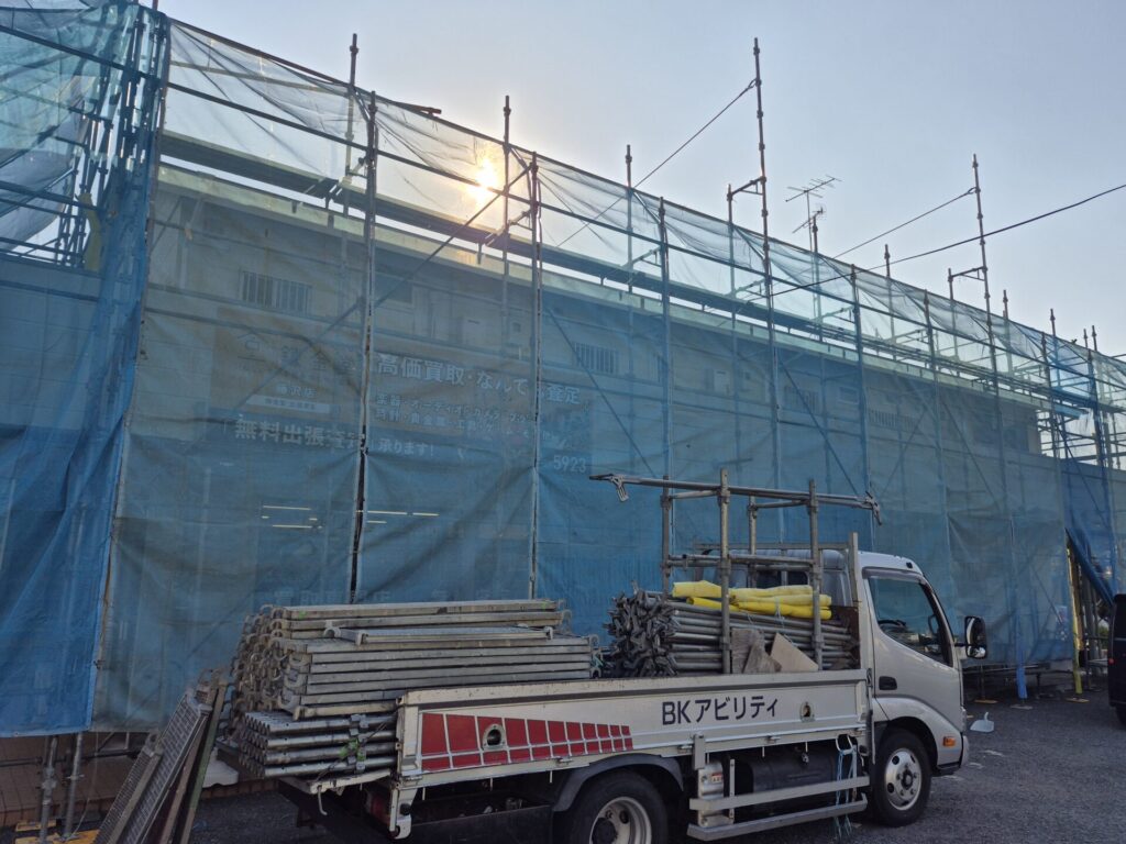 本日より藤沢市六会にてアパートの足場着工致しました。
