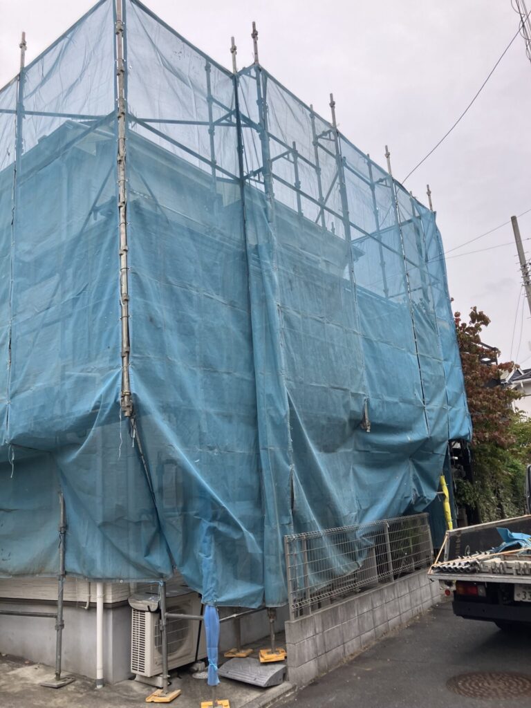 また、藤沢市辻堂新町にてY様邸の足場設置になります。足場は朝イチだけお施主様にご挨拶、足場屋さんに邪魔なものが無いかの確認をしまして足場屋さんに現場を預けました。