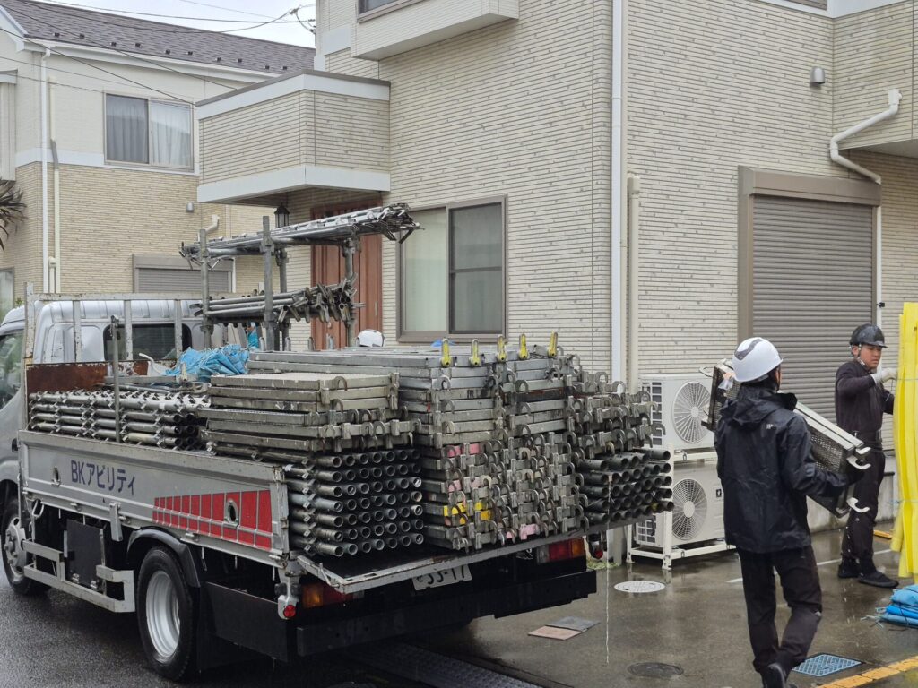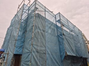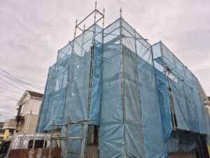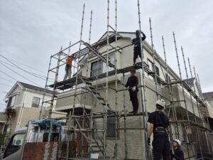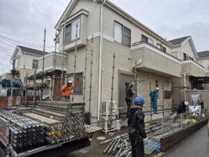 近隣ご挨拶のあとは、まずは足場の設置からになります。