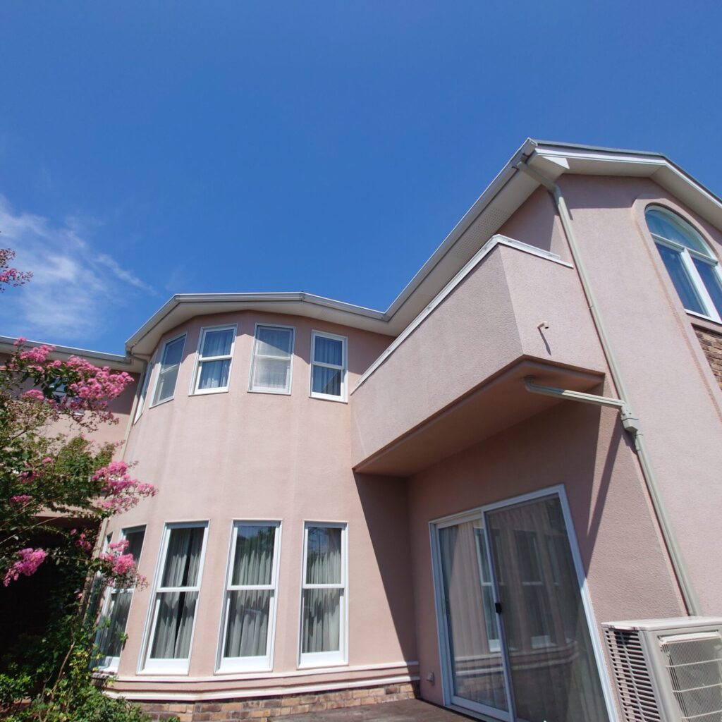 少し年数が経って、建物に馴染み良い感じでした。お施主様からもお褒めいただき、今回は外壁から屋根まで全てのメンテナスをお任せしたいとの嬉しいお言葉ですが、こちらのお施主様は長期のスパンで計画性を持ってメンテナスをお考えなので、次の工事のお話もしていく中で私の考えとしましては、屋根塗装はあまり意味を成さないと判断しまして、次回のメンテナスの際に葺き替える、もしくはカバーする事が良いのではとお伝えしまして、今回は外壁と付帯部、バルコニーの笠木のカバー、建物の飾り水切り板金のカバー。